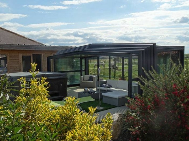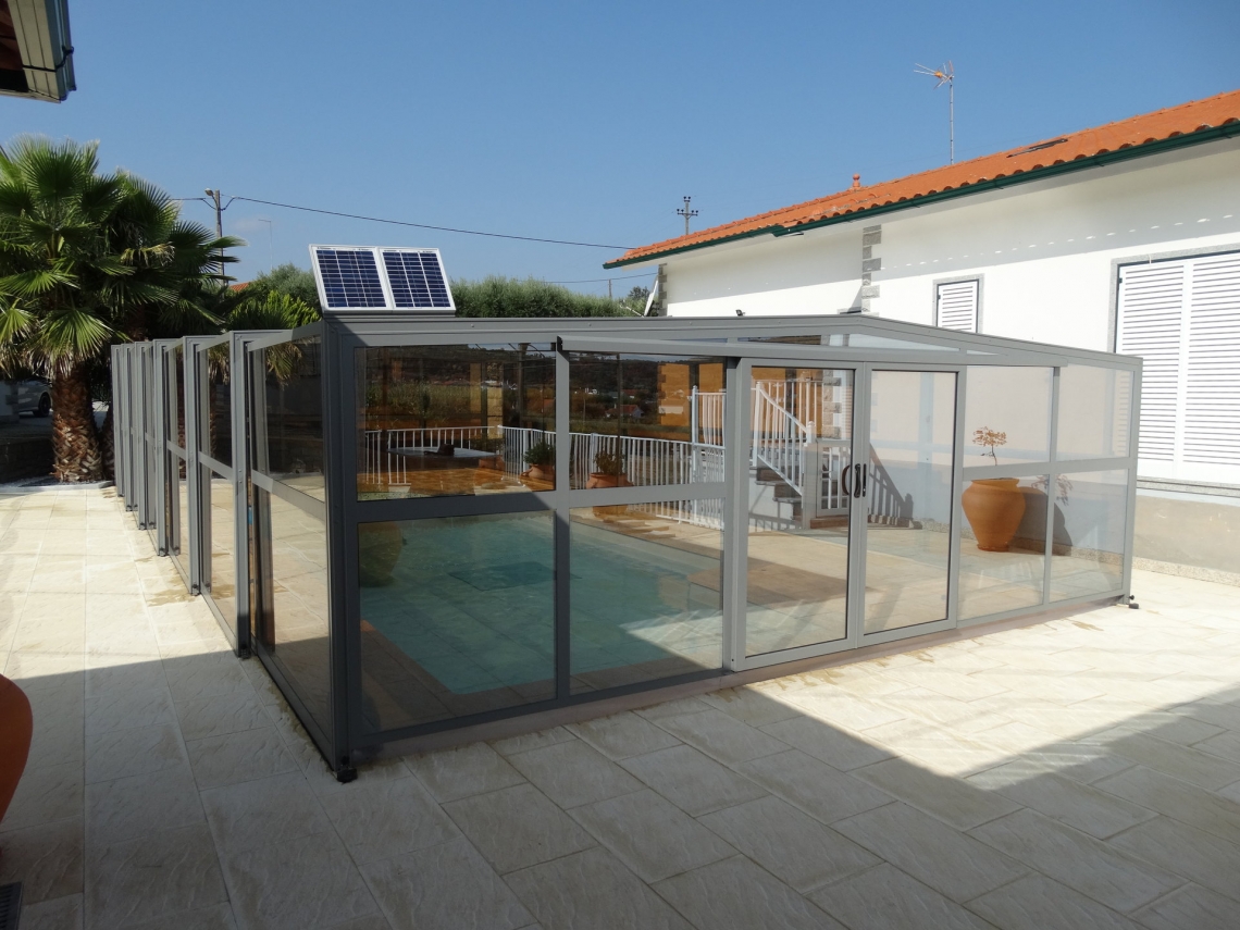 O sistema telescópico permite destapar a piscina facilmente: recolhendo os módulos para um ou ambos os topos volta a ter uma piscina ao ar livre.