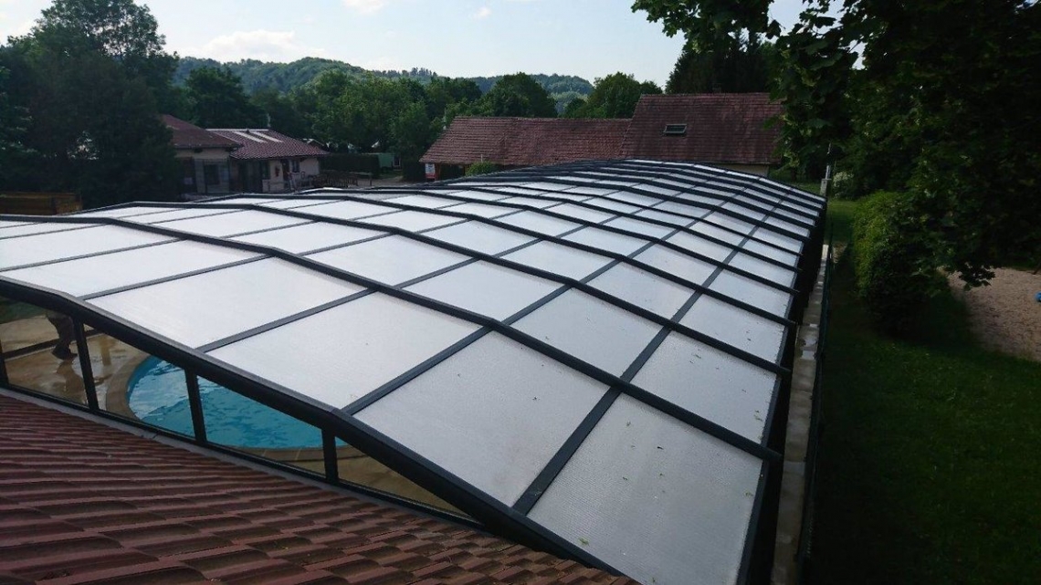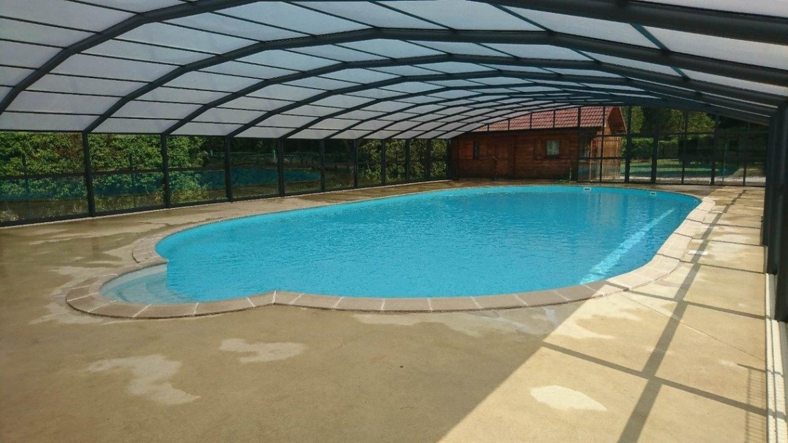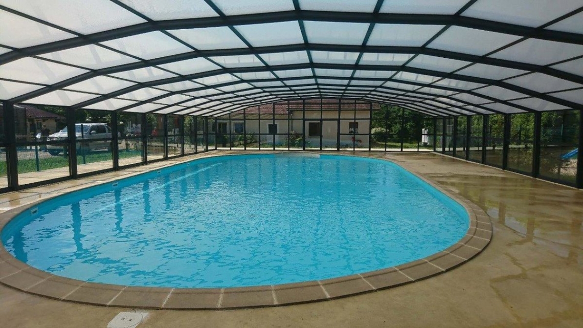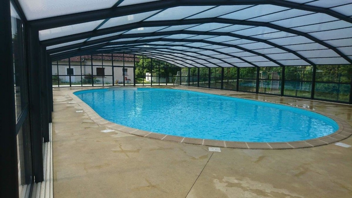 A cobertura ideal em piscina publica usada durante o ano inteiro: modelo cobertura alta Premium, 12 módulos (10 telescópicos); topos fixos; abertura central; acoplada ao espaço de apoio à piscina; paredes em vidro duplo 4/12/4; teto em policarbonato alveolar 16mm tratamento UV nas duas faces; portas anti-pânico.