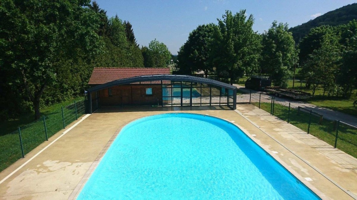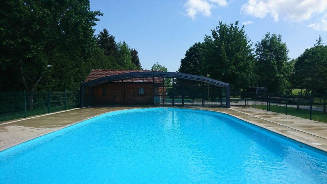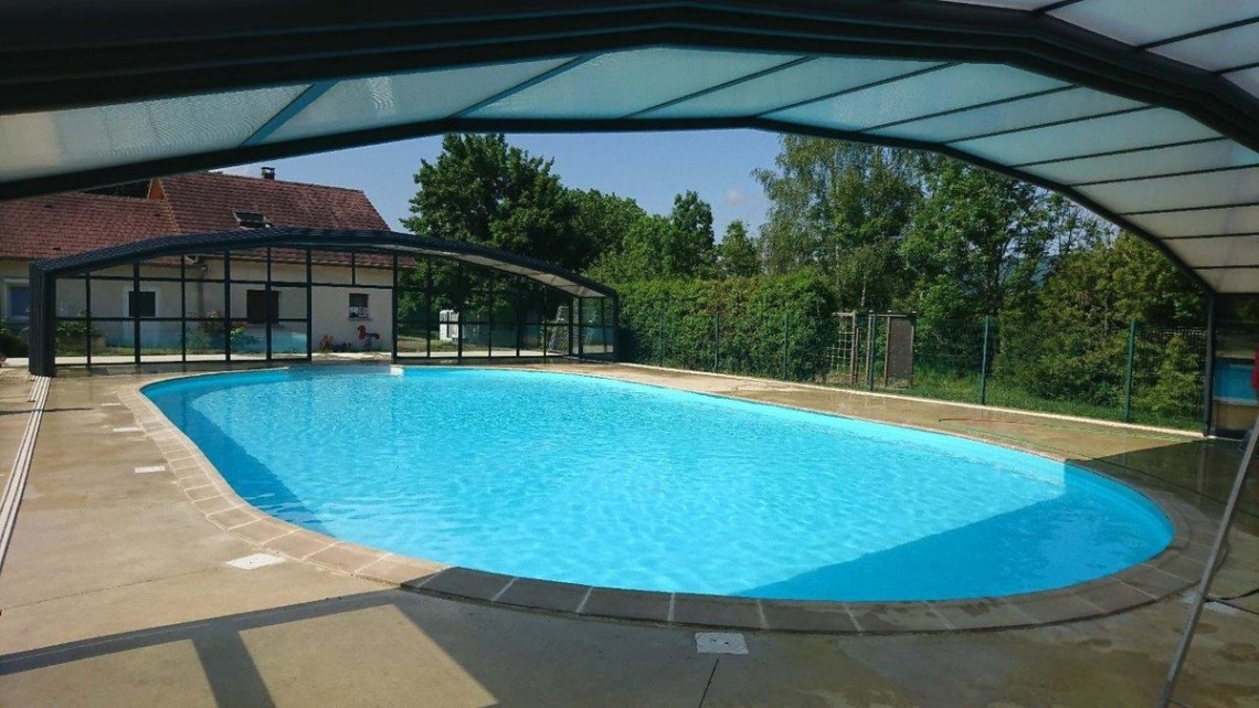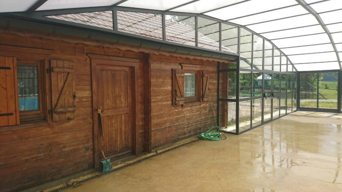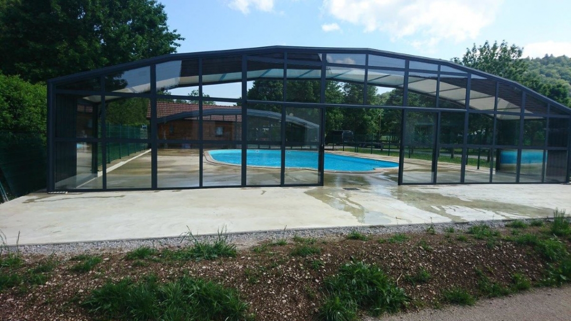 A cobertura ideal em piscina publica usada durante o ano inteiro: modelo cobertura alta Premium, 12 módulos (10 telescópicos); topos fixos; abertura central; acoplada ao espaço de apoio à piscina; paredes em vidro duplo 4/12/4; teto em policarbonato alveolar 16mm tratamento UV nas duas faces; portas anti-pânico.