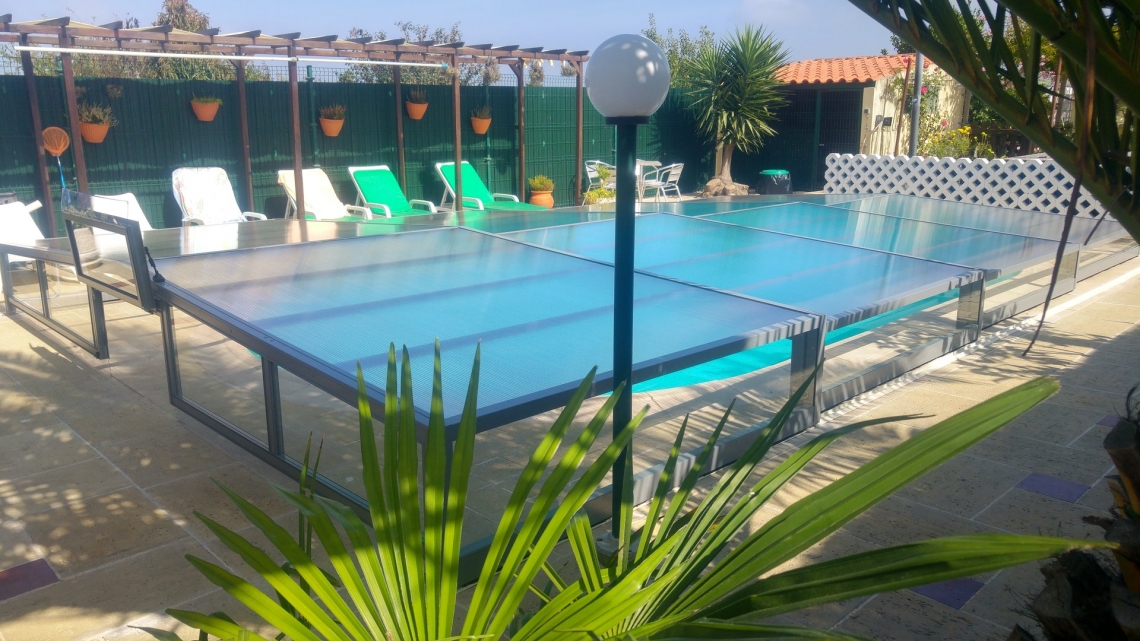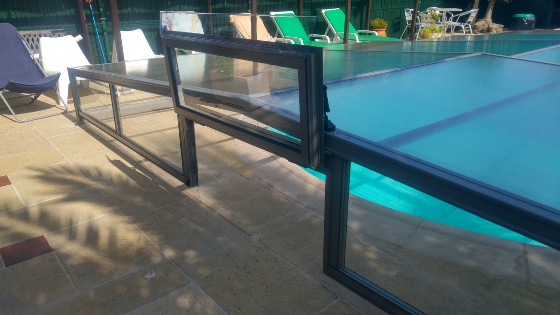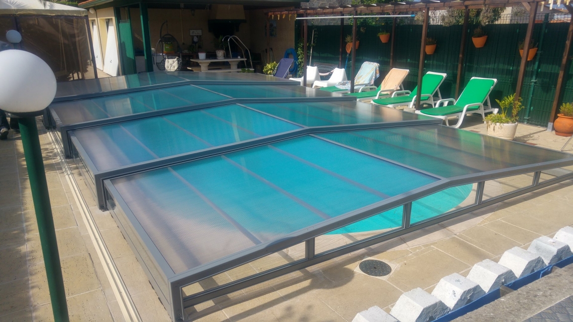 Cobertura baixa 30 ACCES; 4 módulos telescópicos; 1 topo com 1 porta basculante; laterais em vidro temperado 4mm; teto em policarbonato alveolar 4mm UV duas faces; lacagem do aluminio cinza médio; guia no solo numa lateral a todo o comprimento