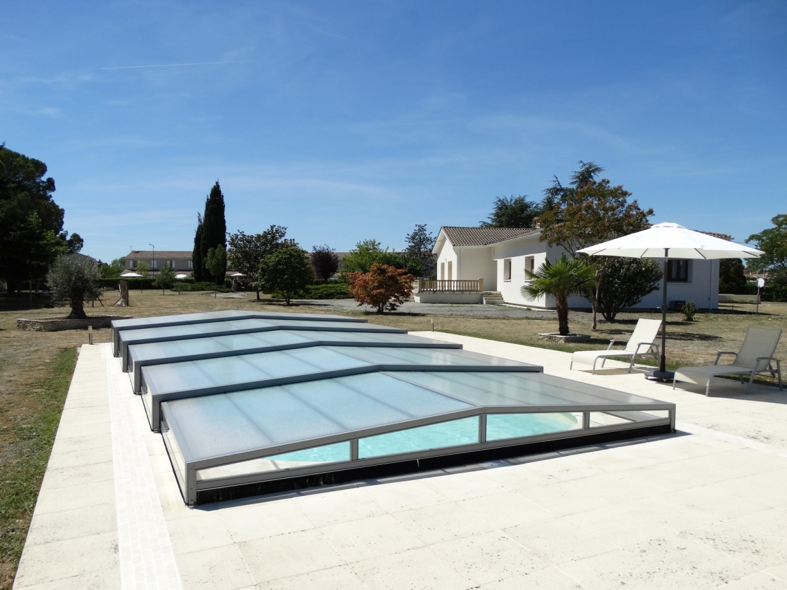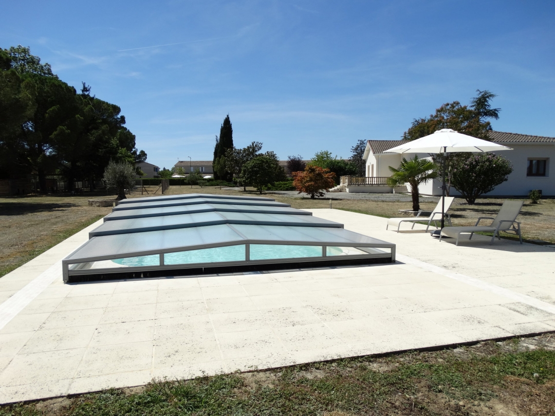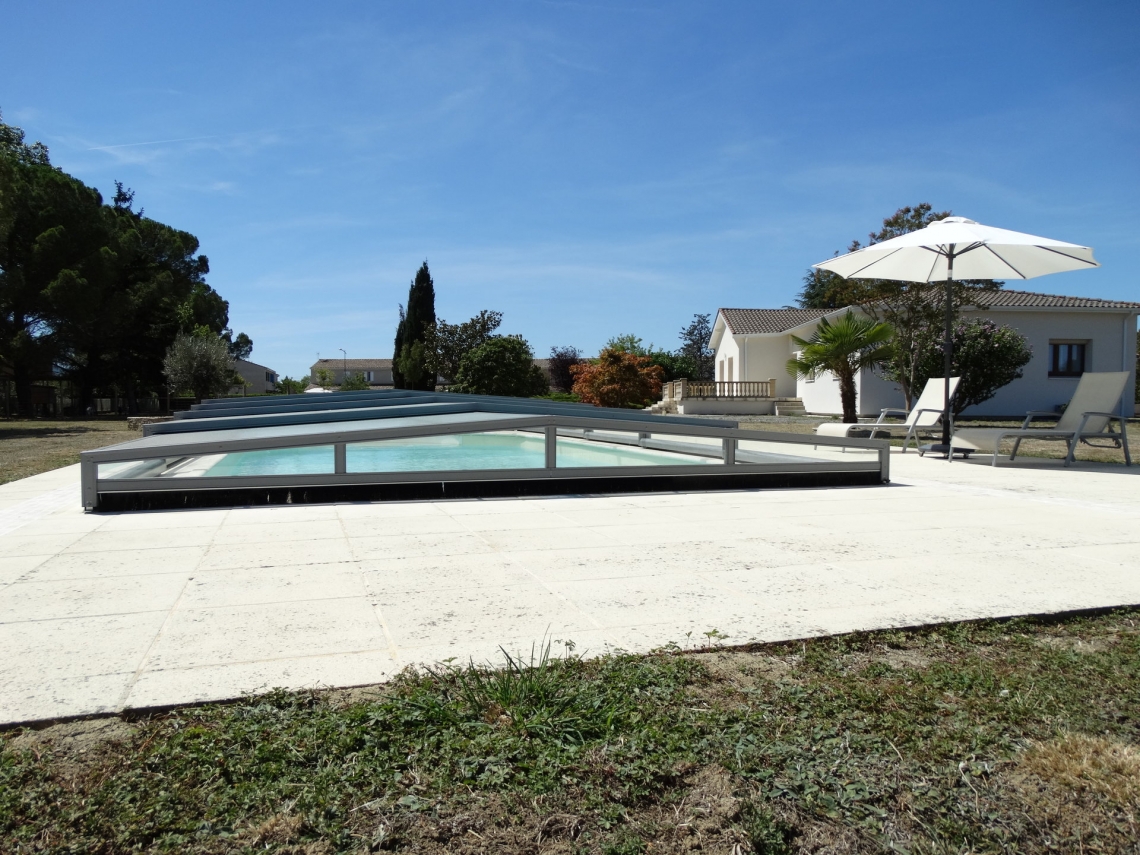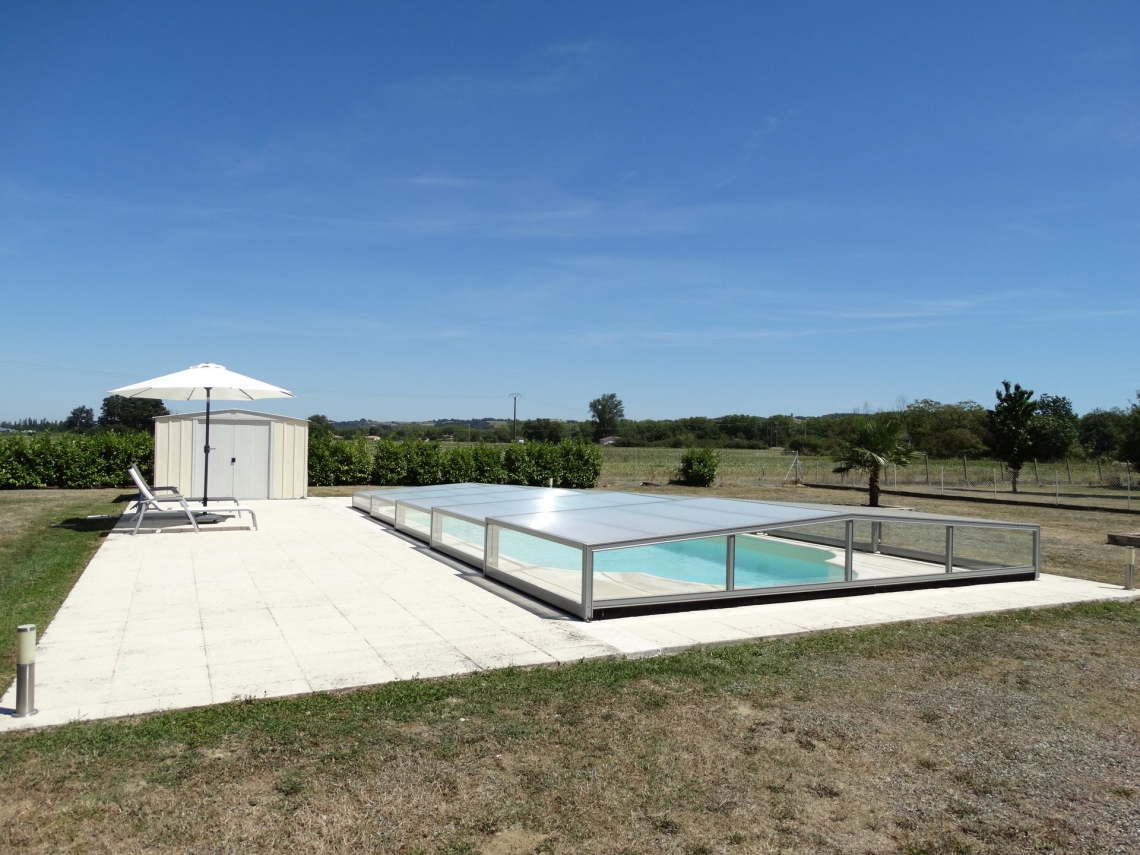 Cobertura baixa Acces, 5 módulos telescópicos; topos sem aberturas; laterais em vidro temperado 4mm; teto policarbonato alveolar 8mm UV duas faces; ancoragem ao solo; aluminio lacado cinza médio.