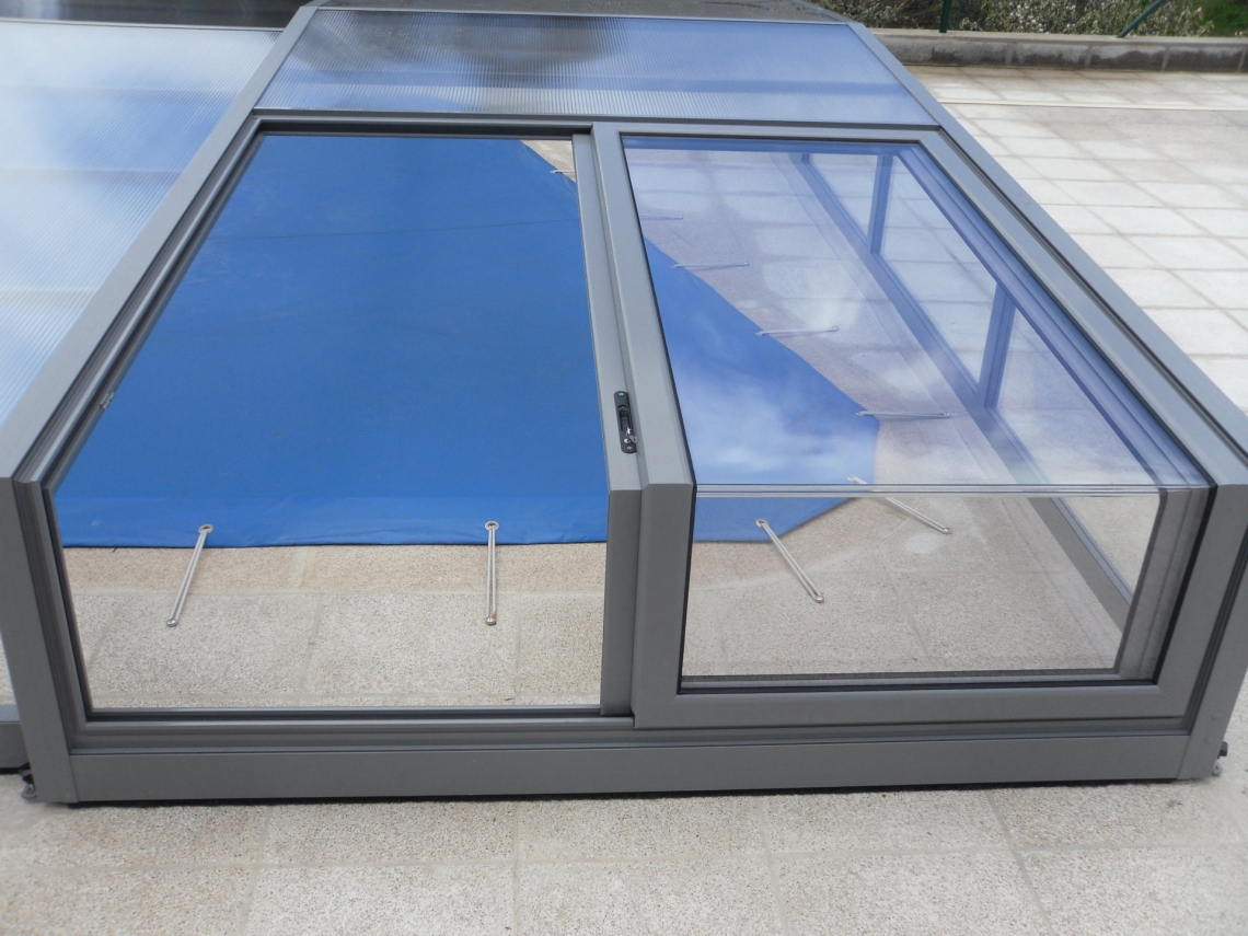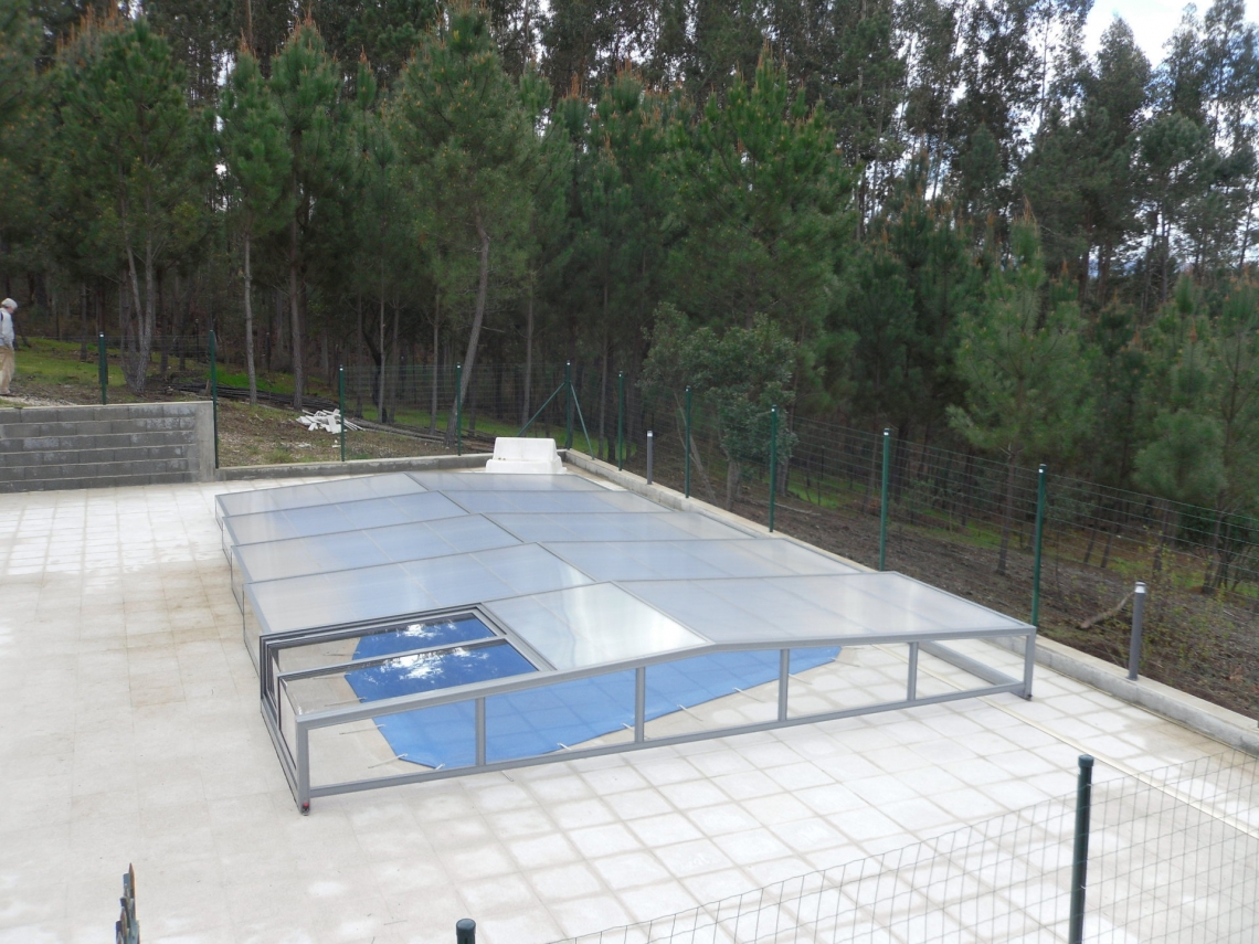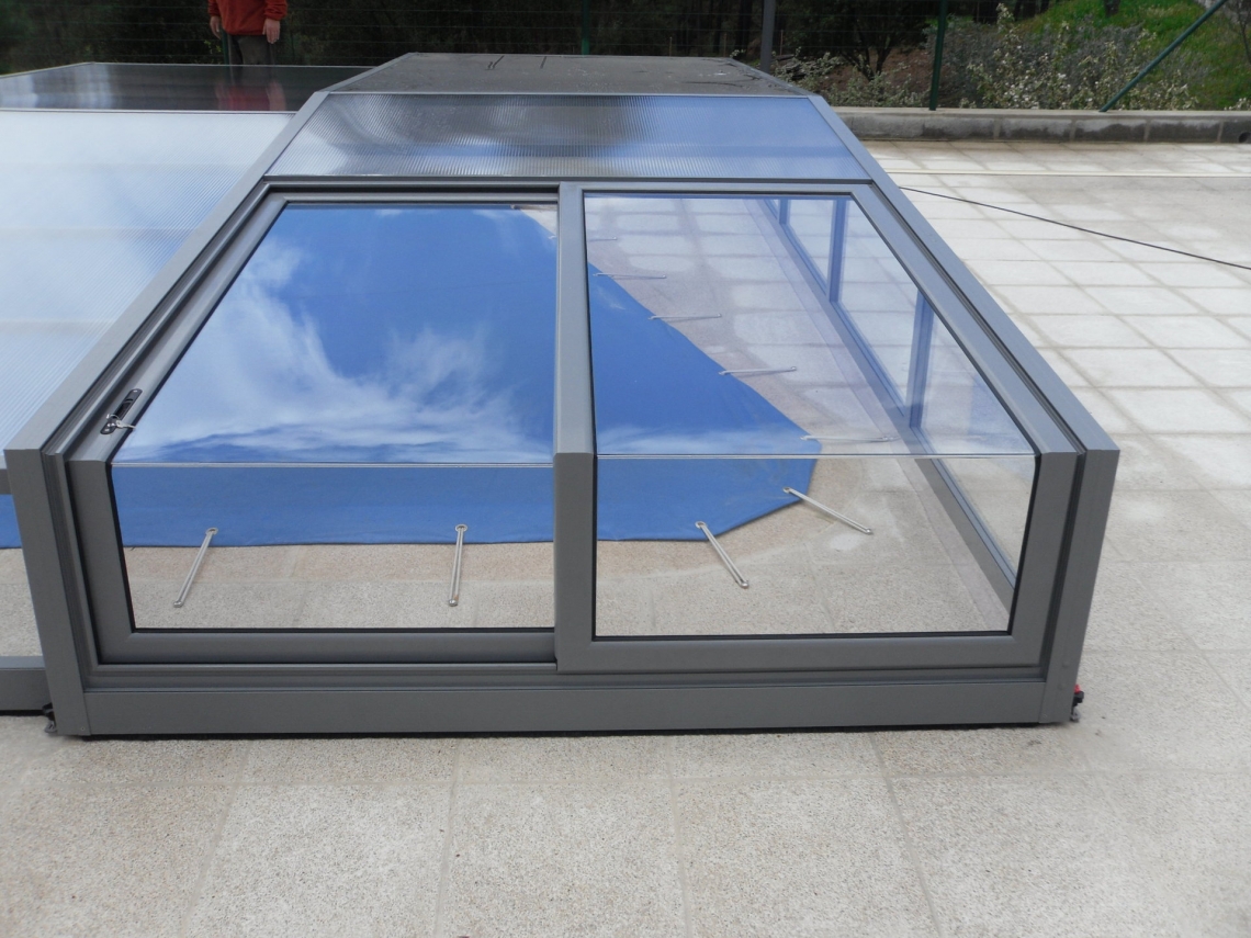Cobertura baixa 30 Acces, 5 módulos telescópicos; abertura de teto para nadar sem ter que destapar a piscina; paredes em vidro temperado 4mm; teto em policarbonato alveolar 8mm; lacagem do aluminio cinza médio RAL 7037; guia de deslizamento no solo que pode ser prolongada até uma zona recuada para, sempre que queira, manter um espaço de circulação em torno da piscina!