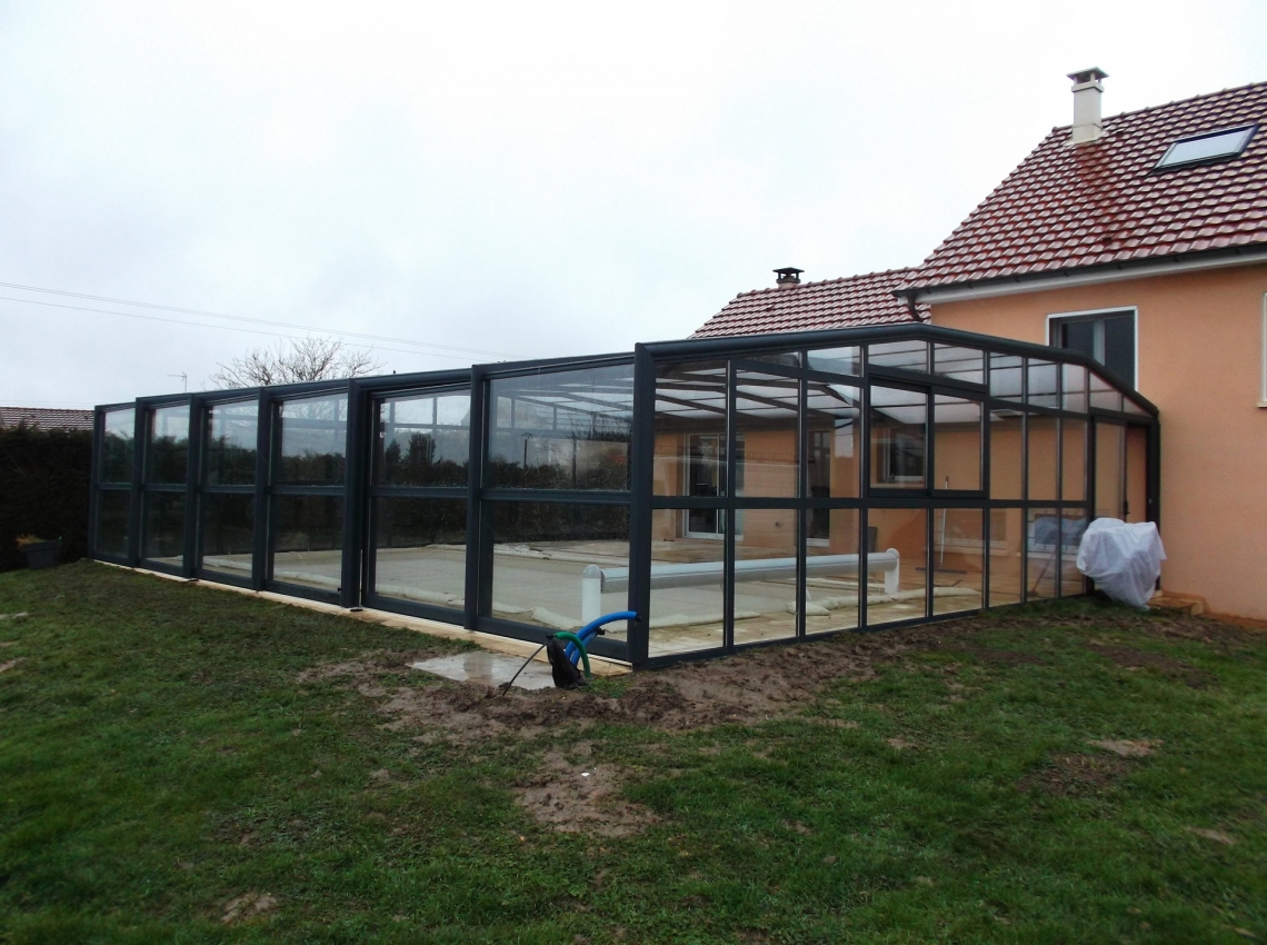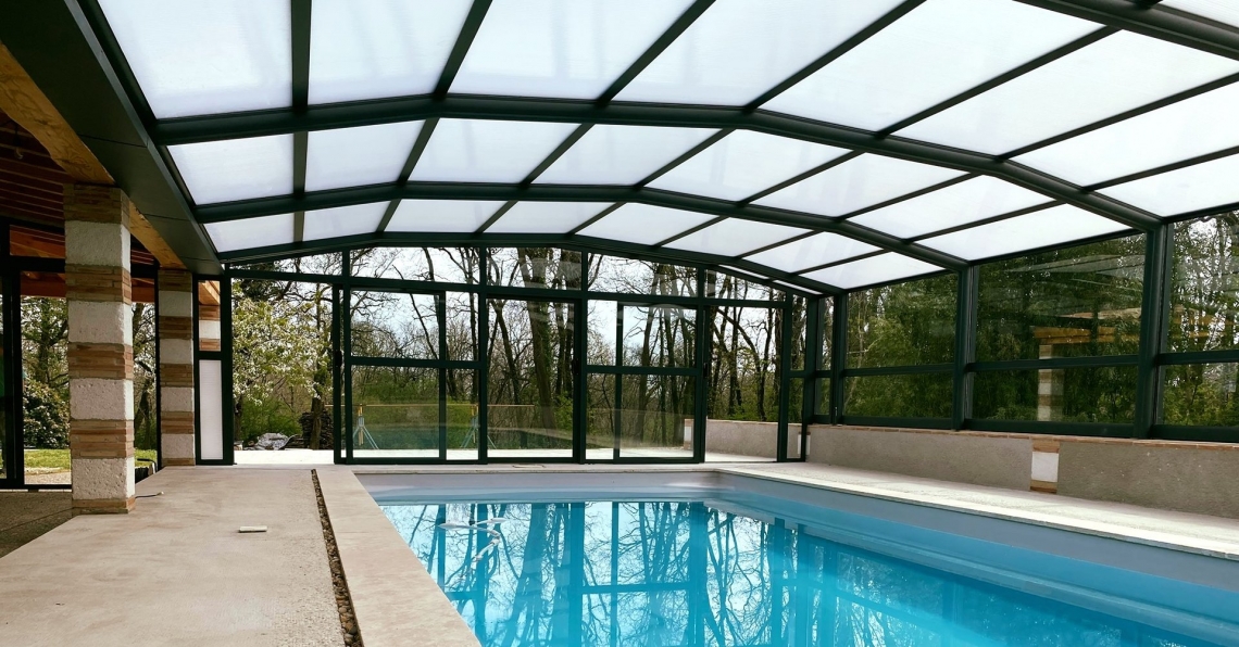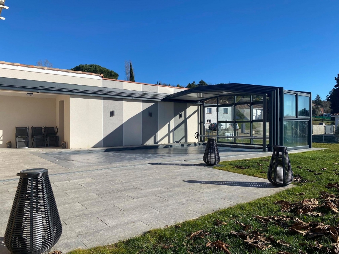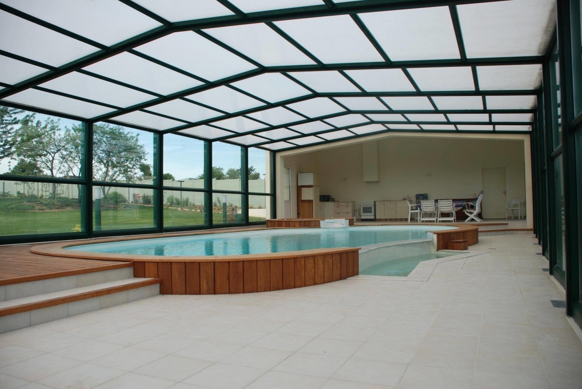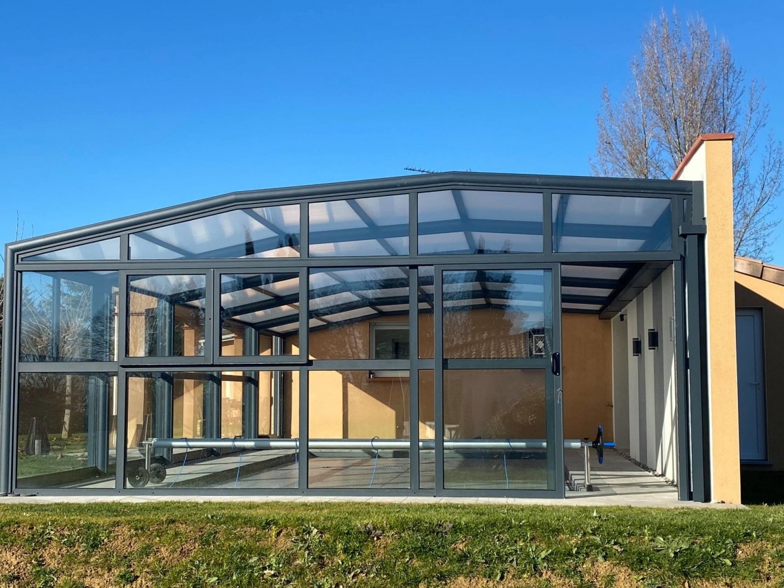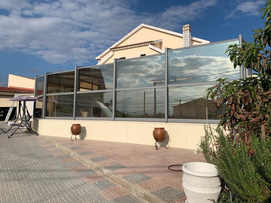 Cobertura adossada, uma lateral instalada sobre muro; carris instalados no interior da caleira de recuperação das aguas pluviais; um topo fixo com porta de correr; arco de estanquecidade numa das estremidades contra muro existente; abertura central; paredes em vidro duplo 4/12/4