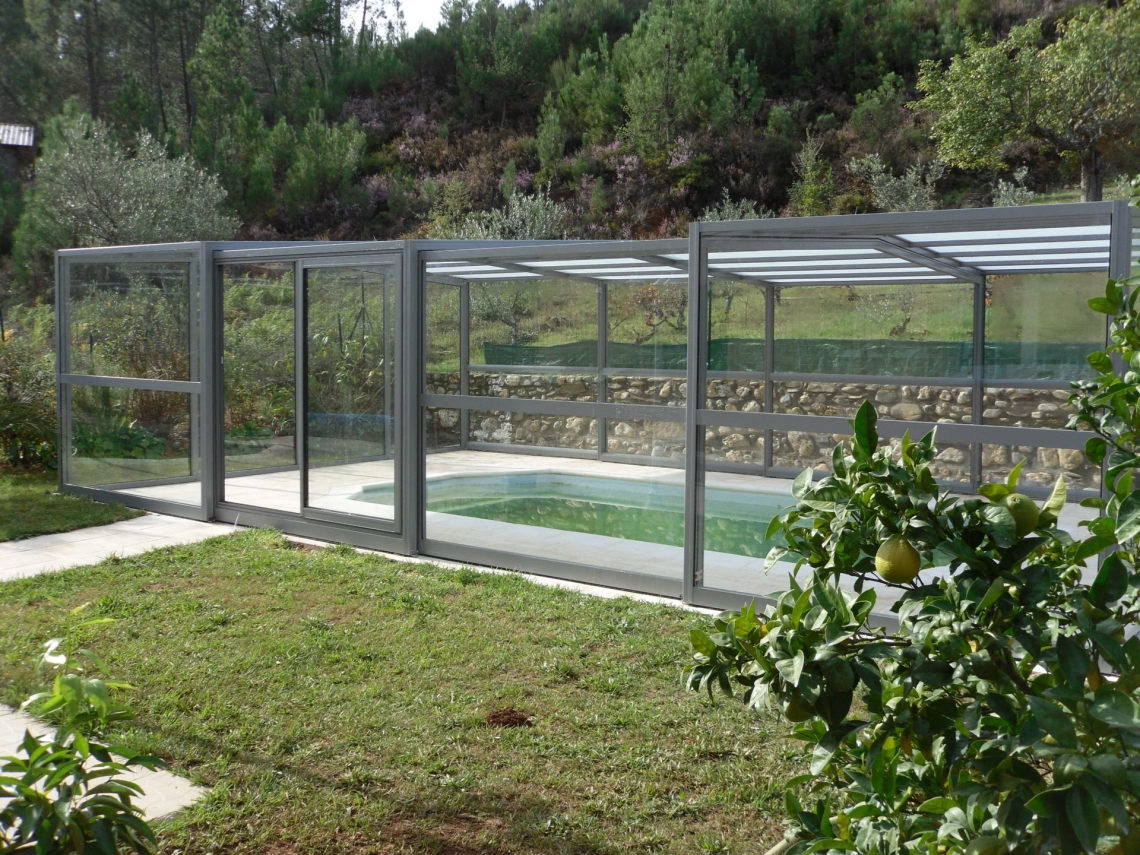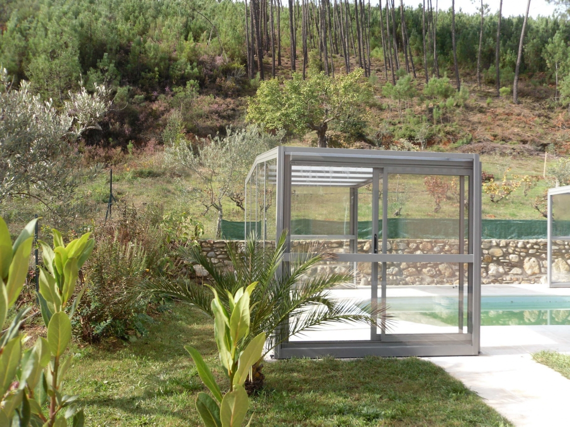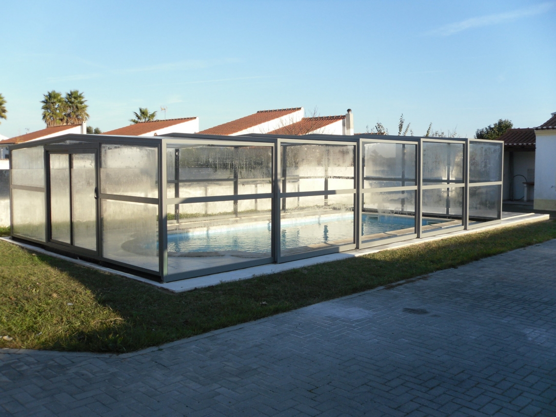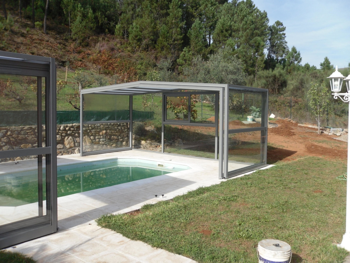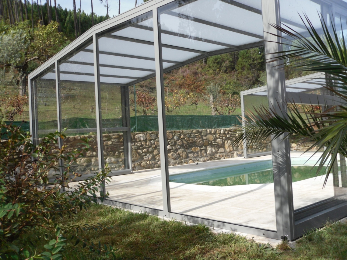 Cobertura alta Acces laterais em vidro temperado de 4mm; teto em policarbonato alveolar de 8mm tratamento UV duas faces; estrutura em aluminio lacado RAL 7037; topos com portas de correr ou tipo fole; ancoragem ao solo em cada módulo; abertura central ou para um dos topos; motorização com paineis solares como opção