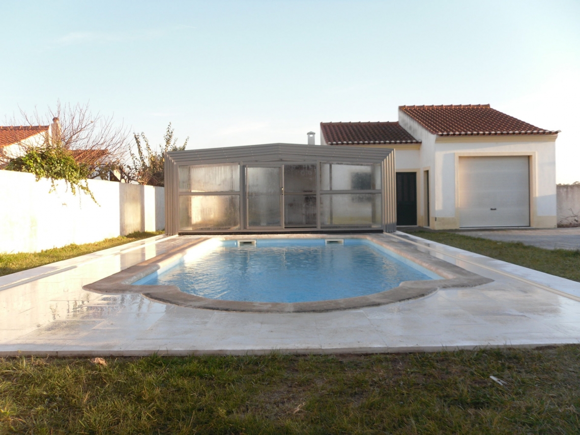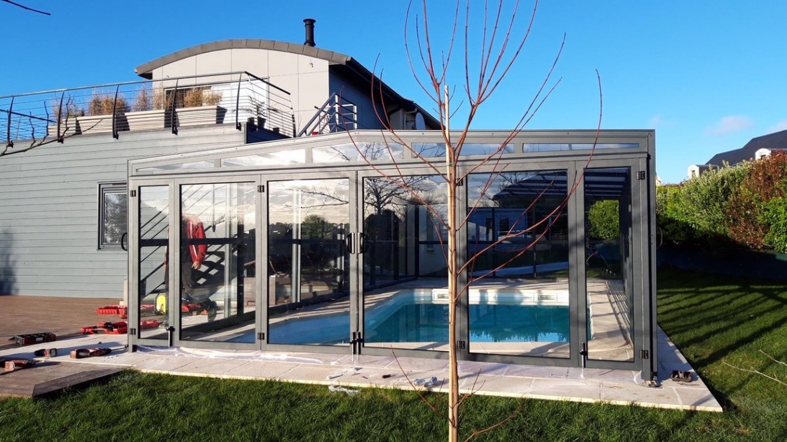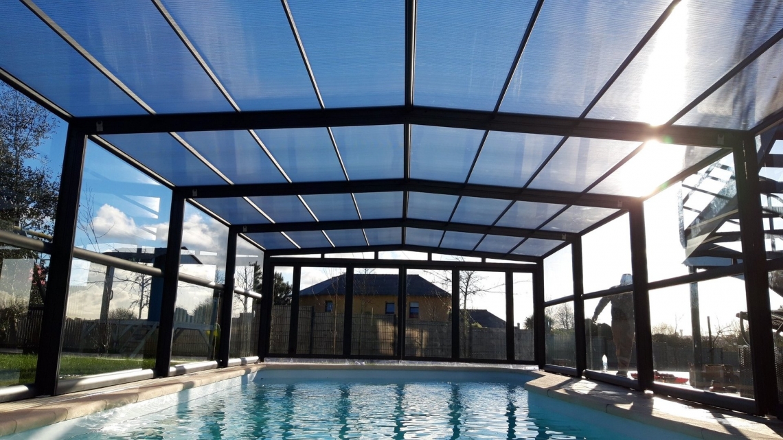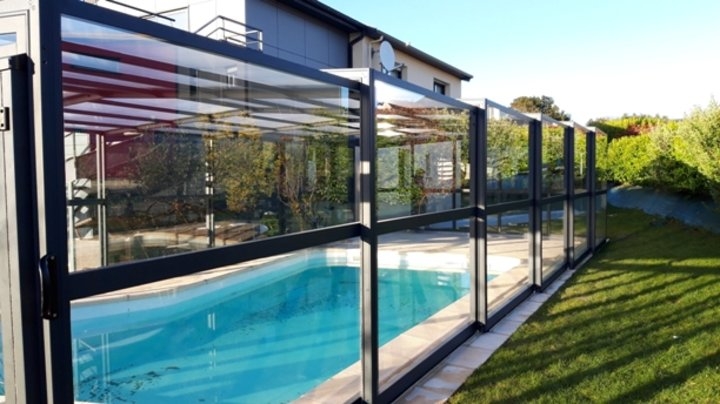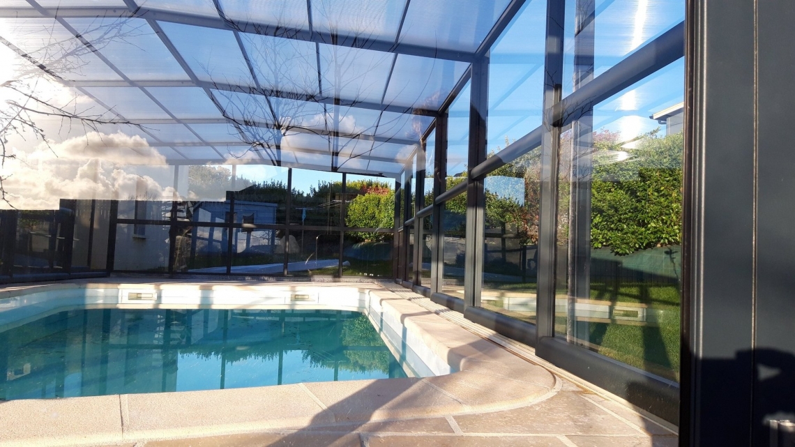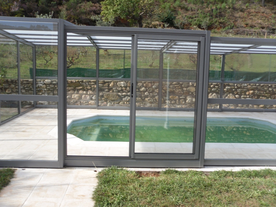 Cobertura alta Acces laterais em vidro temperado de 4mm; teto em policarbonato alveolar de 8mm tratamento UV duas faces; estrutura em aluminio lacado RAL 7037; topos com portas de correr ou tipo fole; ancoragem ao solo em cada módulo; abertura central ou para um dos topos; motorização com paineis solares como opção