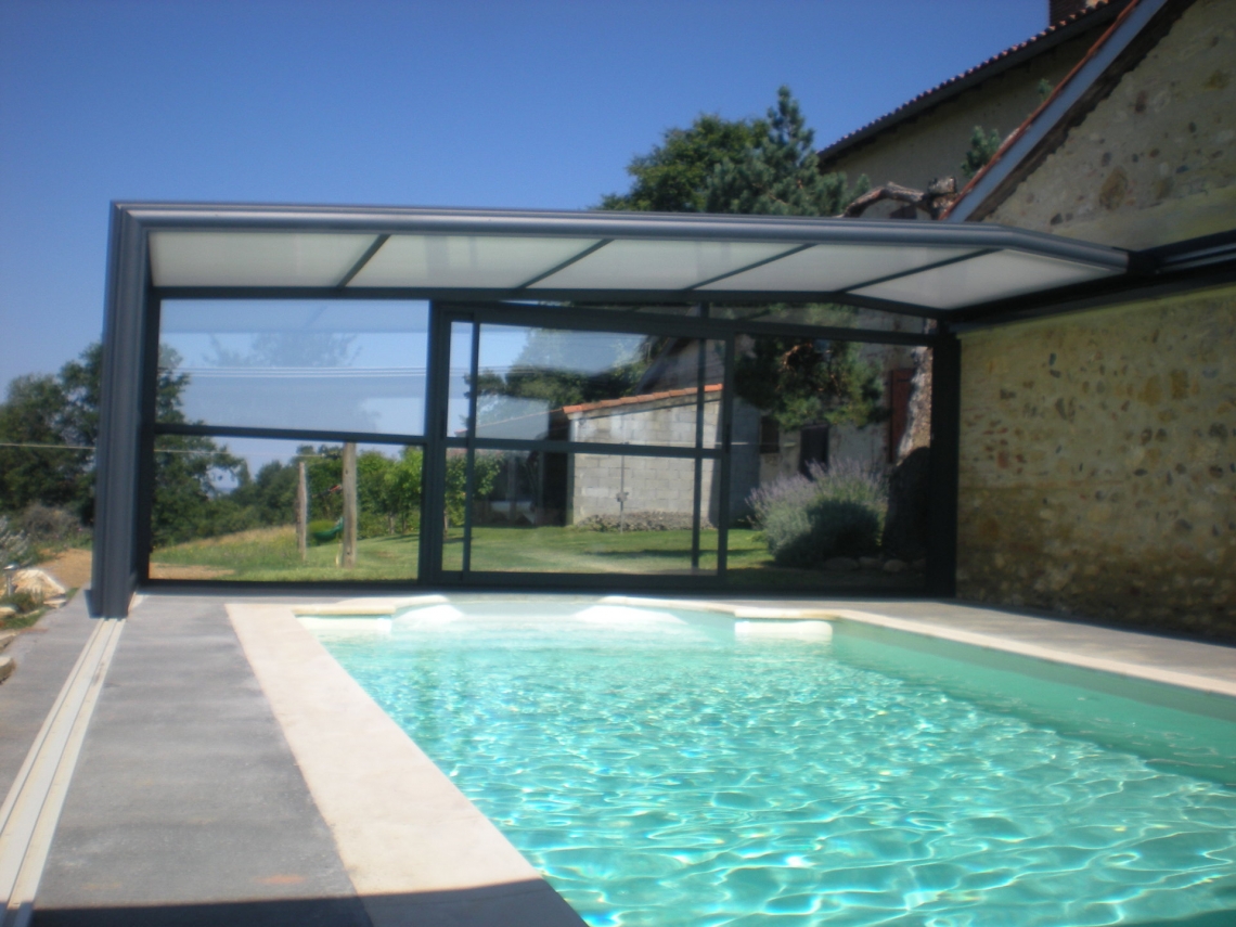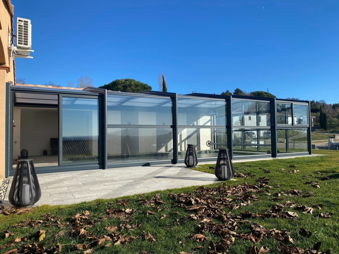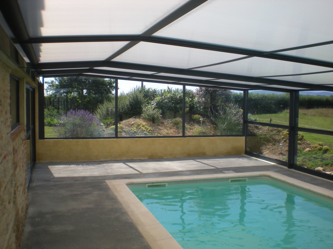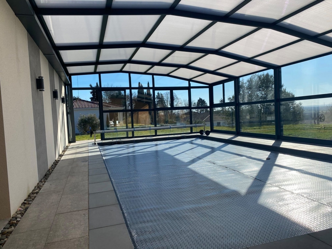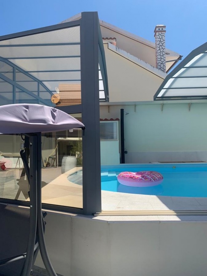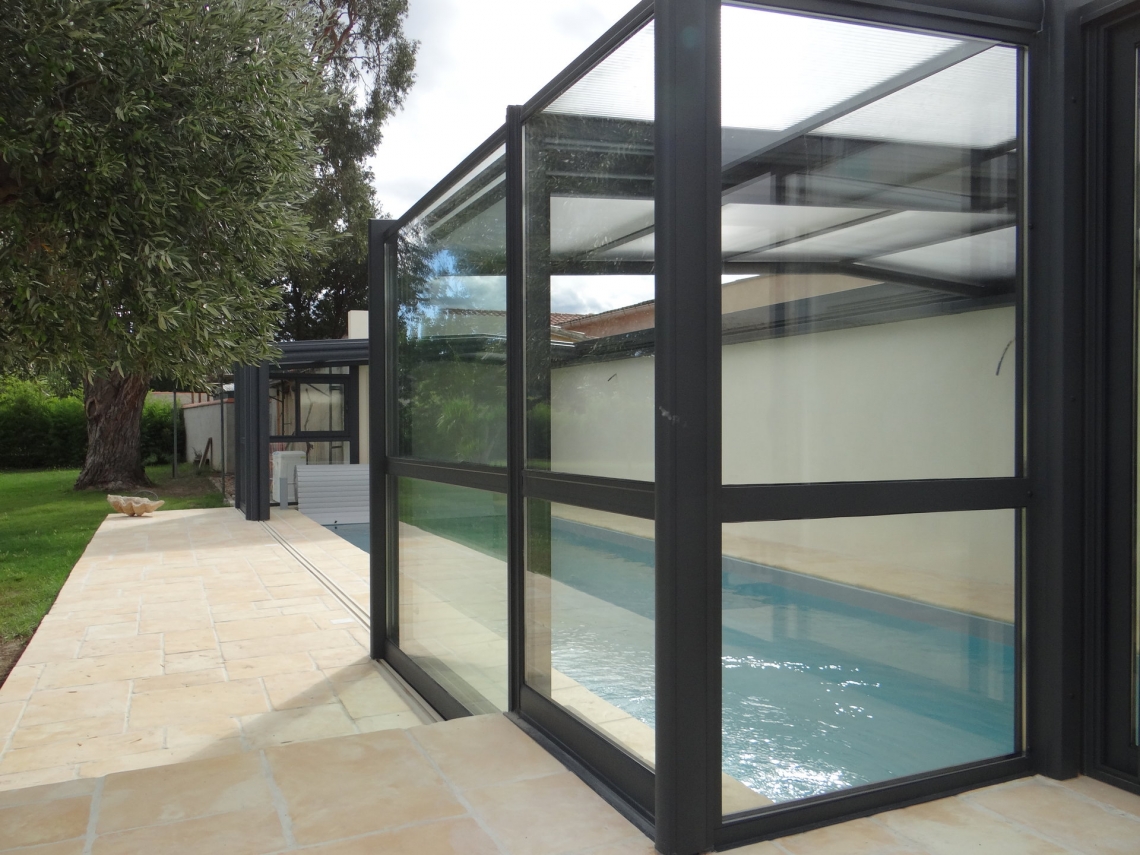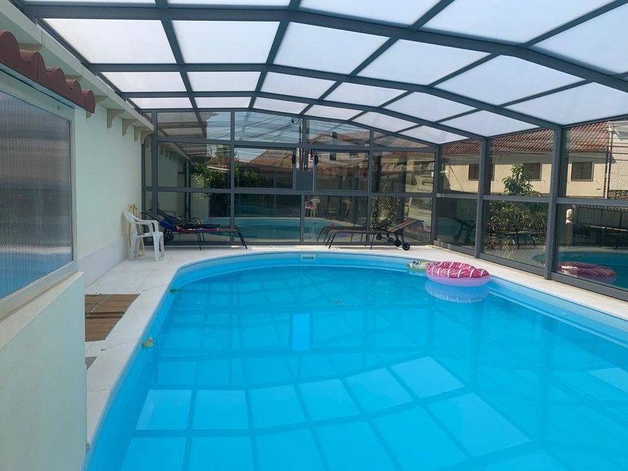 Cobertura adossada, uma lateral instalada sobre muro ou contra fachada de vivenda/espaço de apoio à piscina; carris instalados no interior da caleira de recuperação das aguas pluviais; módulos das extremidades fixos para uma perfeita estanquicidade; abertura central; paredes em vidro duplo 4/12/4; teto policarbonato alveolar de 16mm; lacagem aluminio QUALICOAT cores standard ou em qualquer cor RAL.