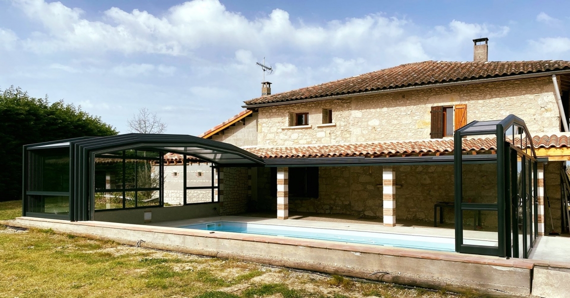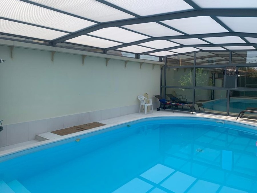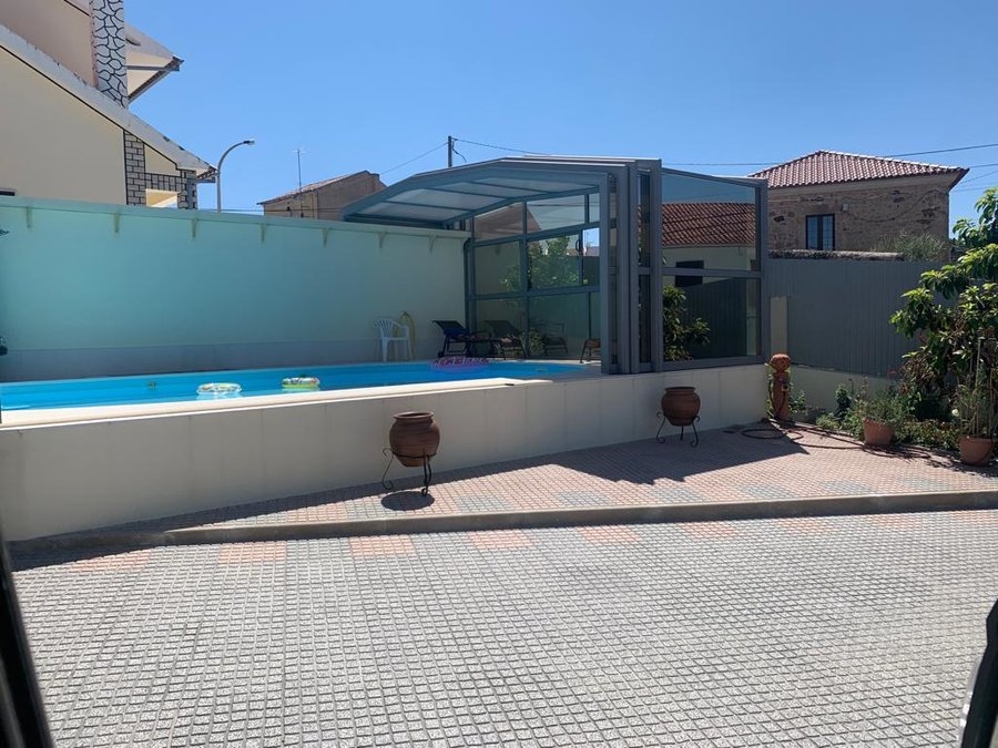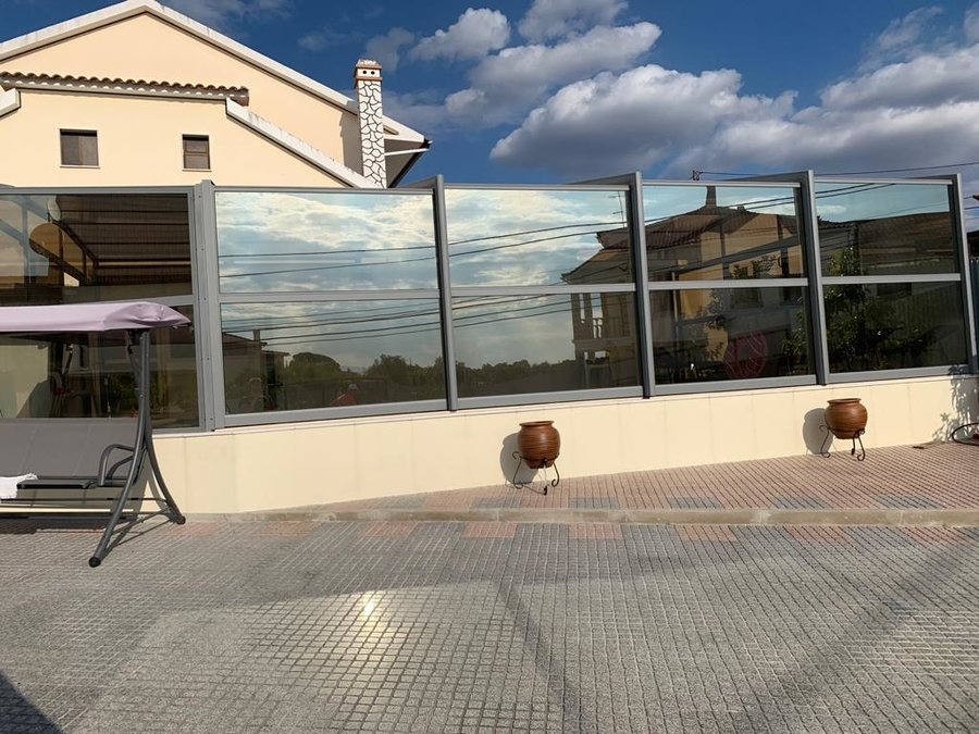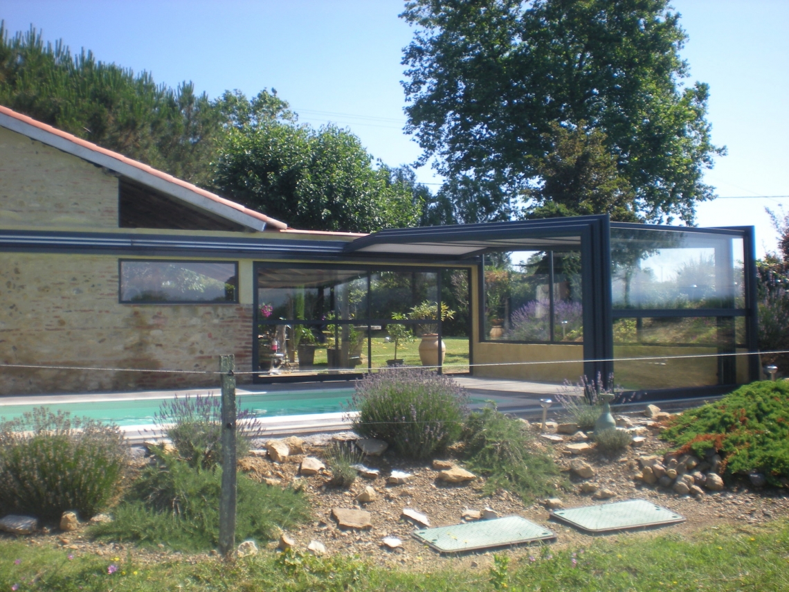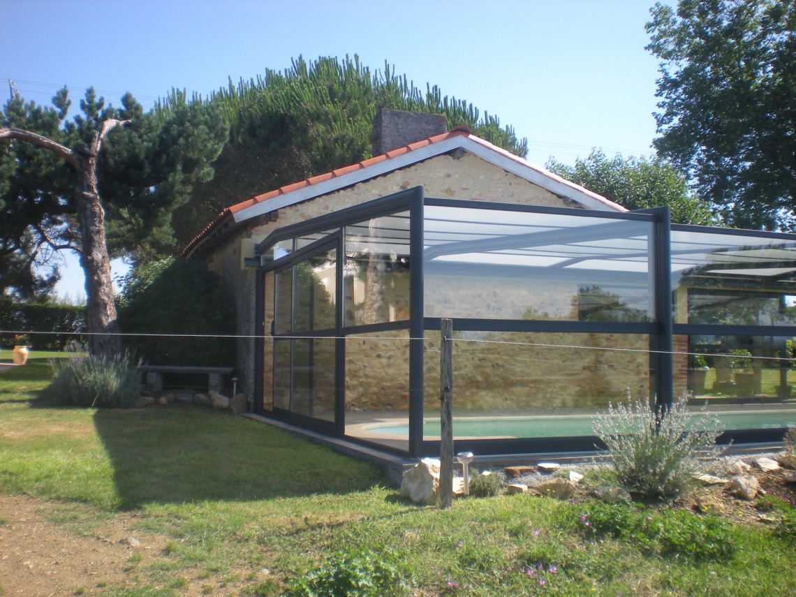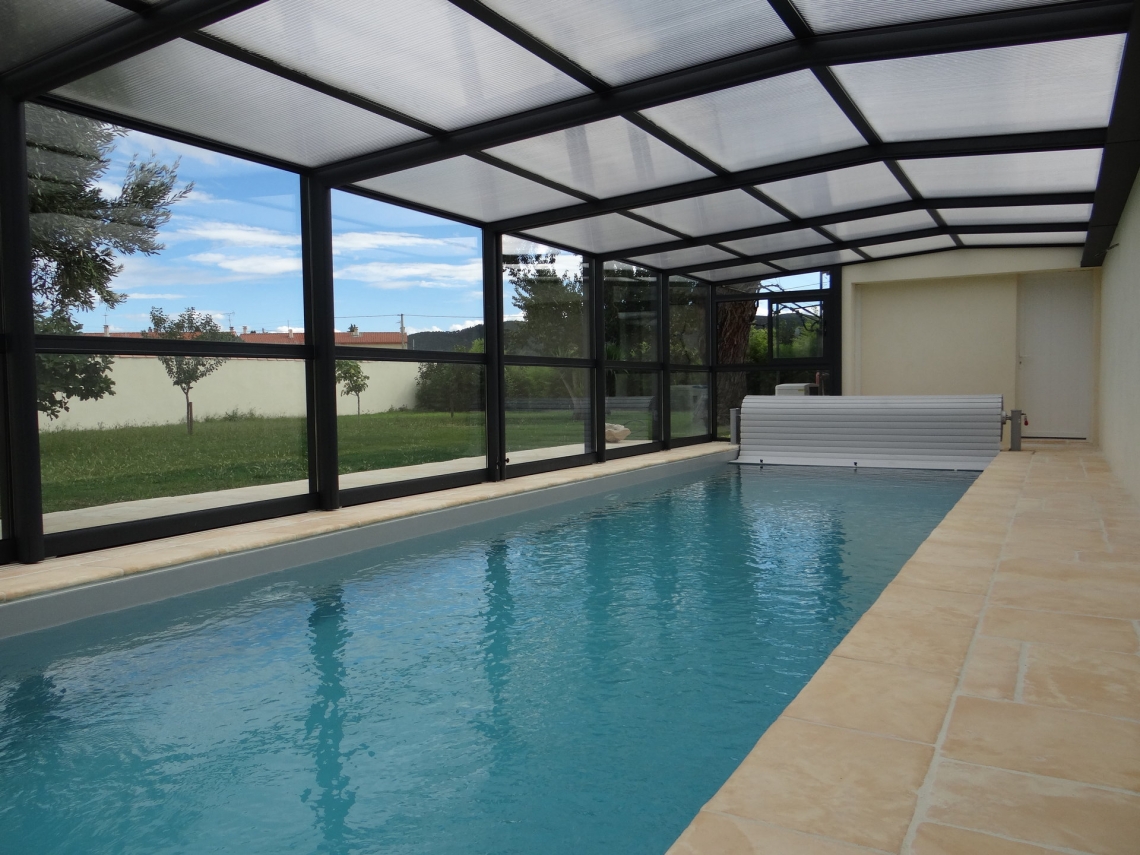Cobertura adossada, uma lateral instalada sobre muro ou contra fachada de vivenda/espaço de apoio à piscina; carris instalados no interior da caleira de recuperação das aguas pluviais; módulos das extremidades fixos para uma perfeita estanquicidade; abertura central; paredes em vidro duplo 4/12/4; teto policarbonato alveolar de 16mm; lacagem aluminio QUALICOAT cores standard ou em qualquer cor RAL.