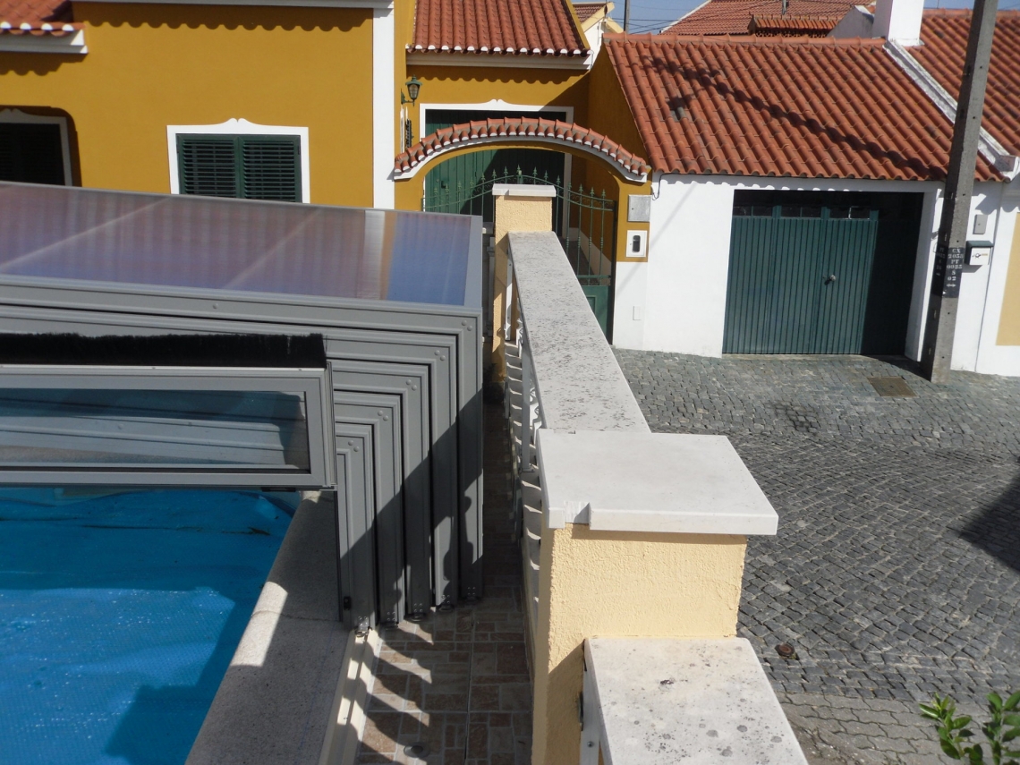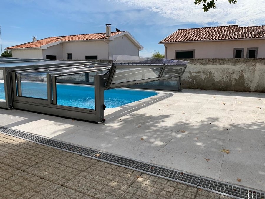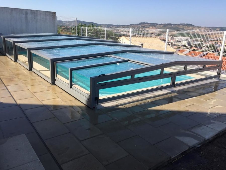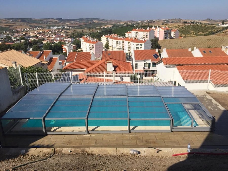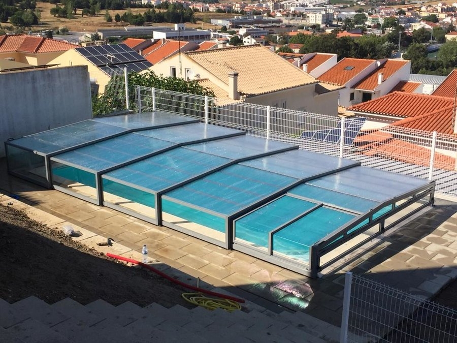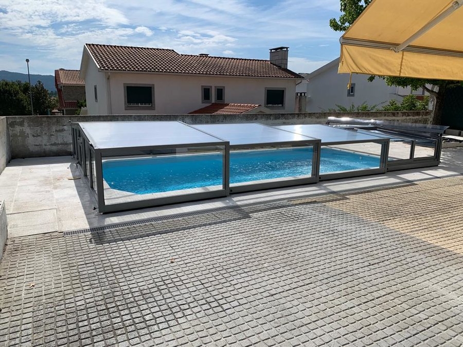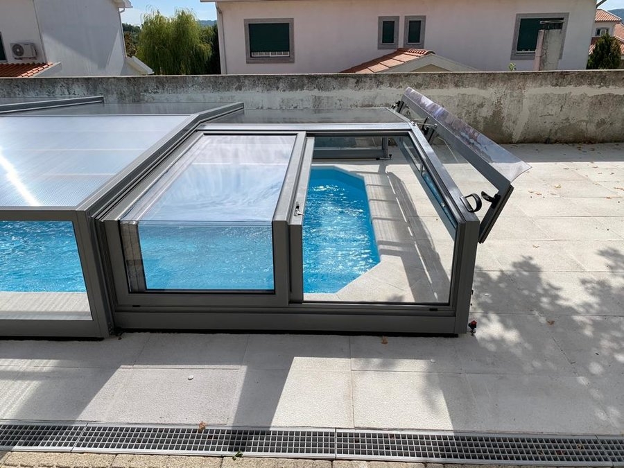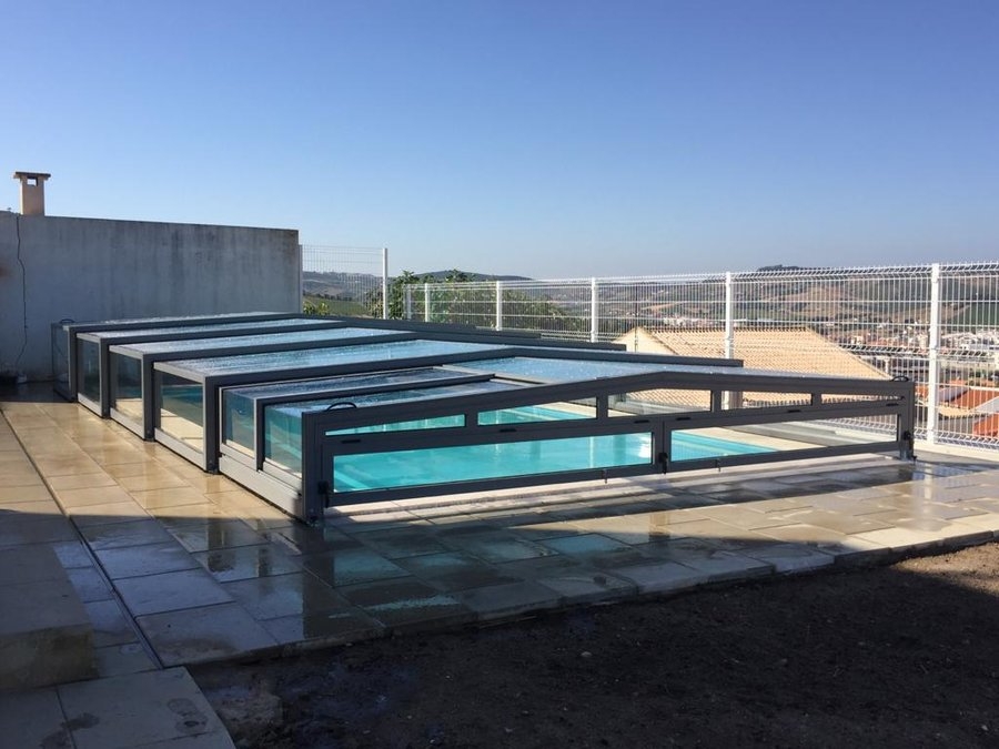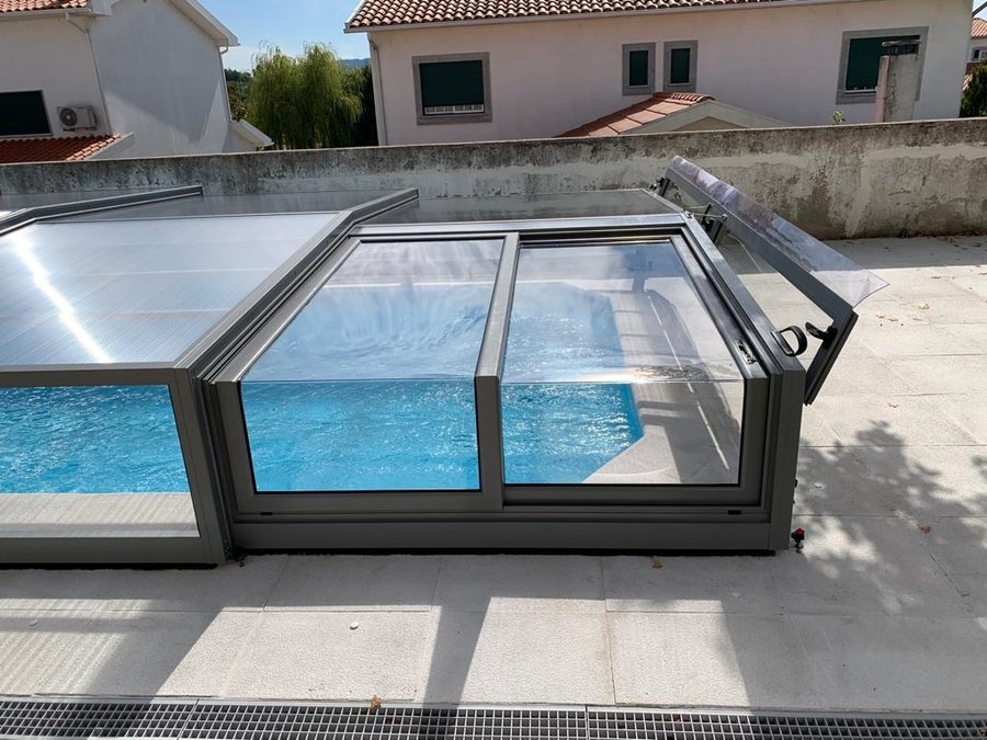 Cobertura baixa sobreelevada Acces: com 60cms na lateral do módulo mais pequeno permite; maior espaço interior para quem pretenda tomar banho com a piscina tapada; ideal para quem pretende cobertura baixa mas tem piscina com escada metálica ou cascata. Laterais em vidro temperado 4mm; teto policarbonato alveolar 8mm UV duas faces; ancoragem ao solo; lacagem aluminio QUALICOAT nas cores standard ou em qualquer cor RAL.