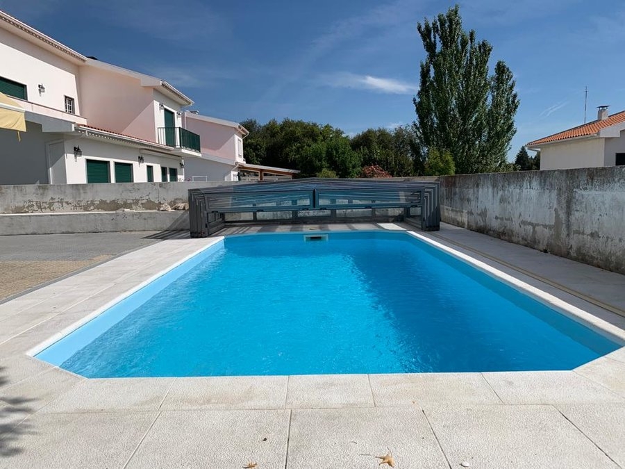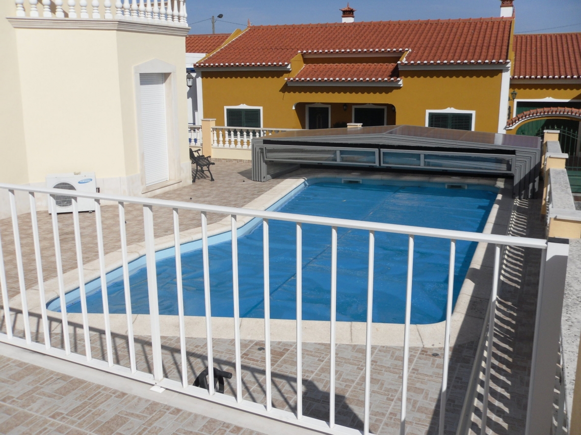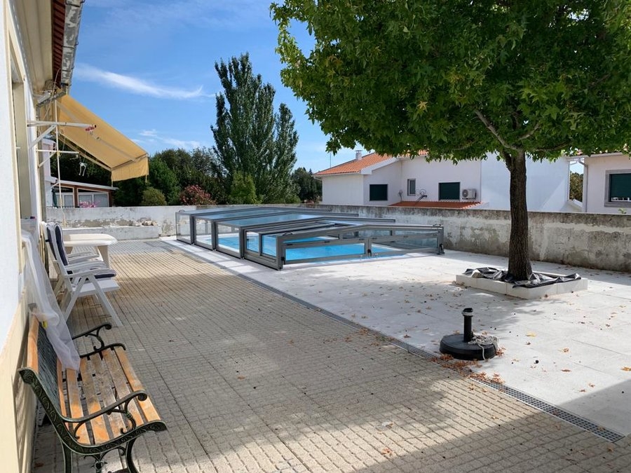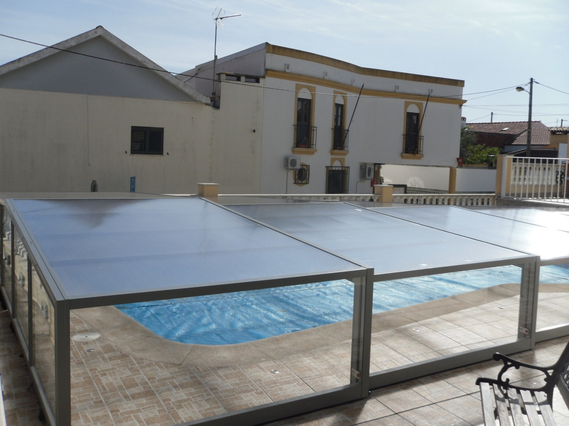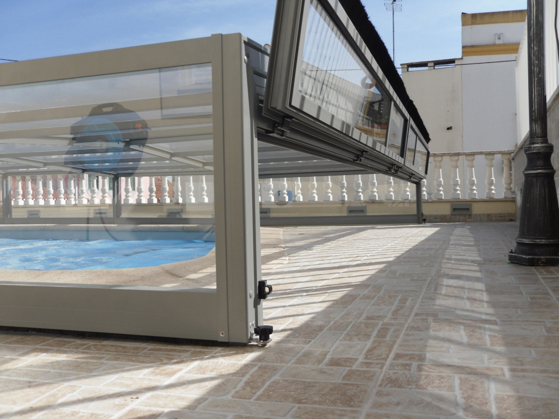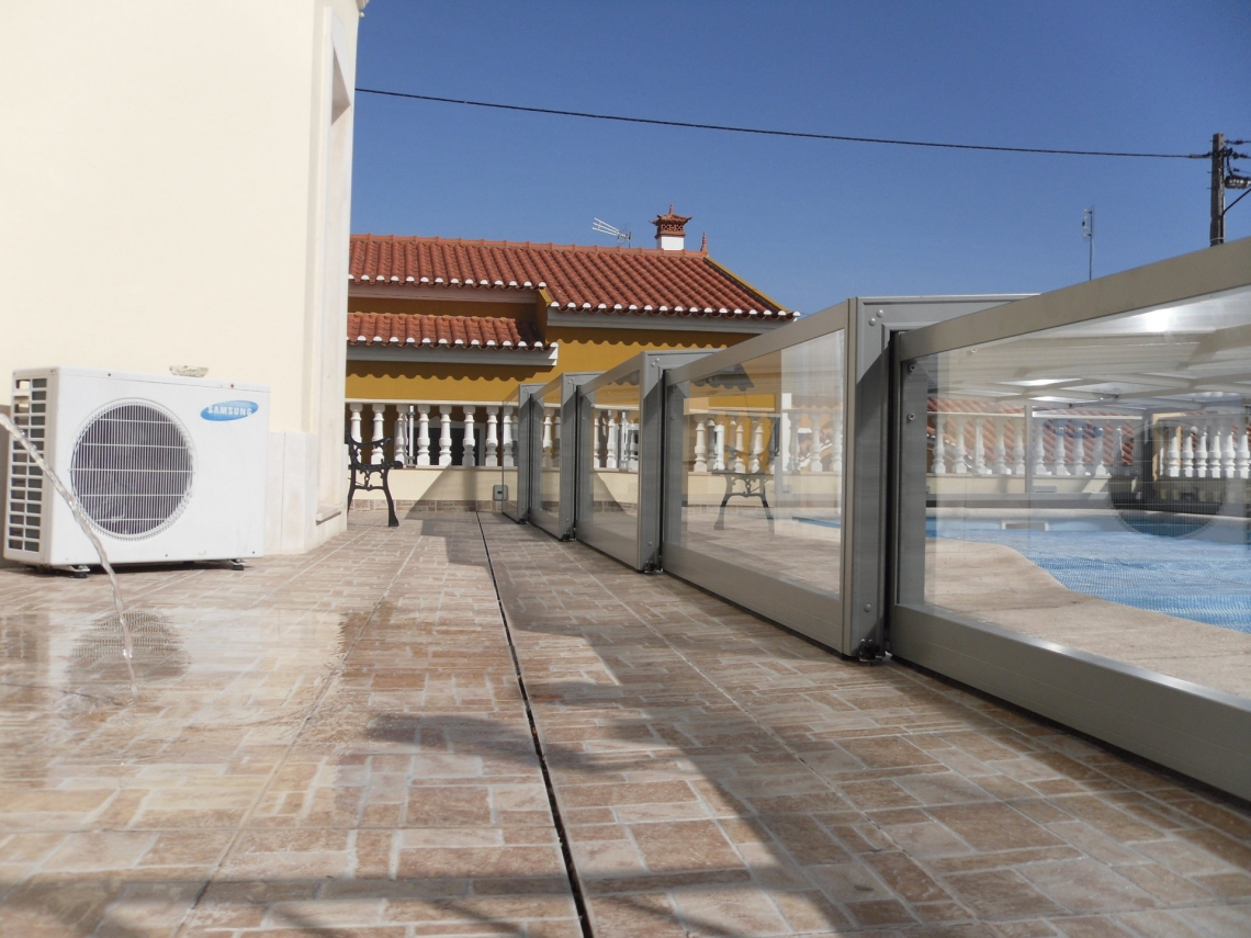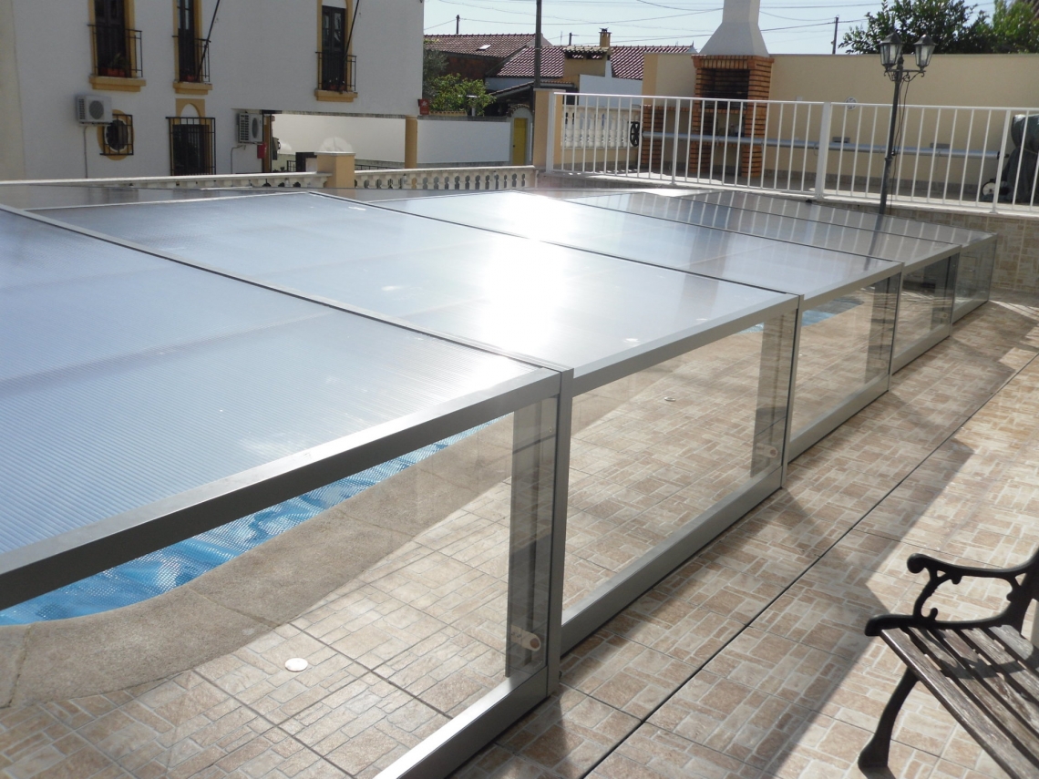 Cobertura baixa sobreelevada Acces: com 60cms na lateral do módulo mais pequeno permite; maior espaço interior para quem pretenda tomar banho com a piscina tapada; ideal para quem pretende cobertura baixa mas tem piscina com escada metálica ou cascata. Laterais em vidro temperado 4mm; teto policarbonato alveolar 8mm UV duas faces; ancoragem ao solo; lacagem aluminio QUALICOAT nas cores standard ou em qualquer cor RAL.
