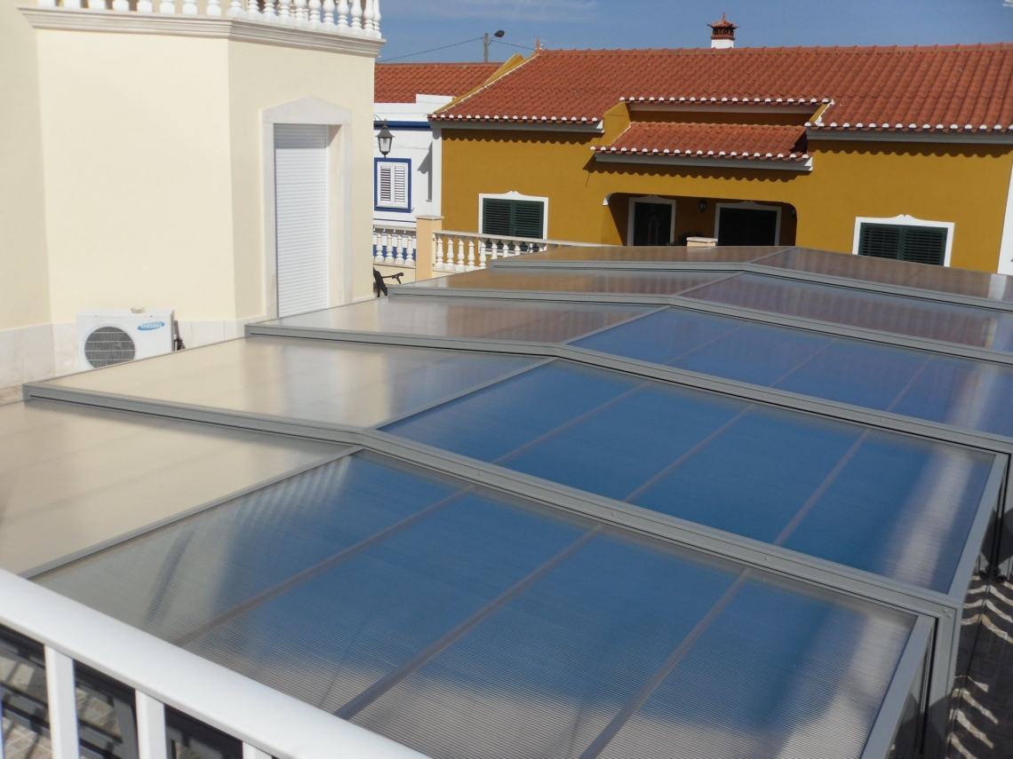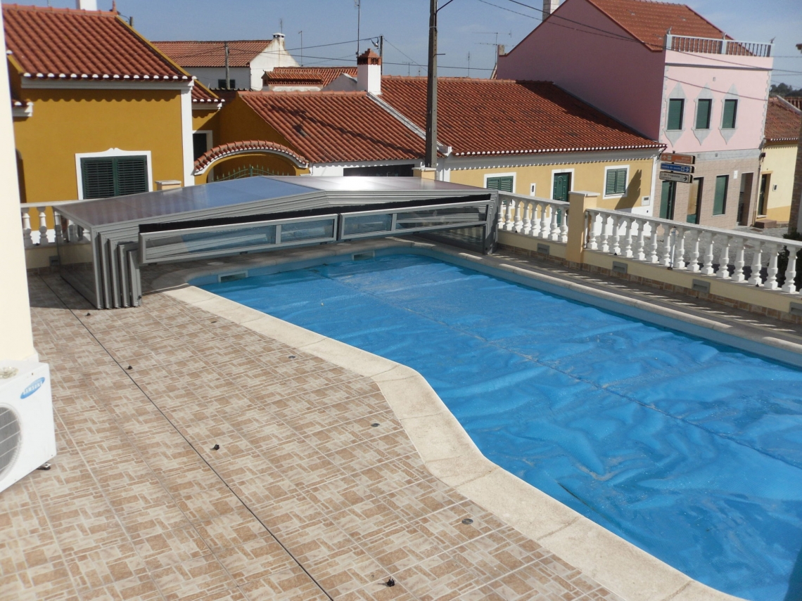 Opções de abertura de teto para entrada na piscina sem recolher a cobertura; topos com ou sem aberturas; topos basculantes a toda a largura; com ou sem motorização.